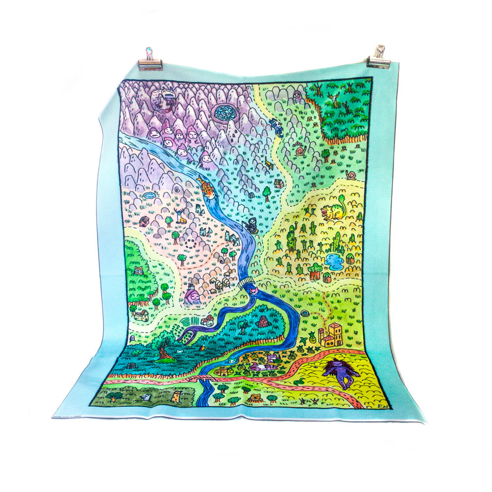 Esteemed illustrator and RPG creator Evlyn Moreau designed this extremely cozy, extremely cute map, and has collaborated with Shel Kahn here at the Sorcerer's Catalogue to paint it and make it available as a fabric map!